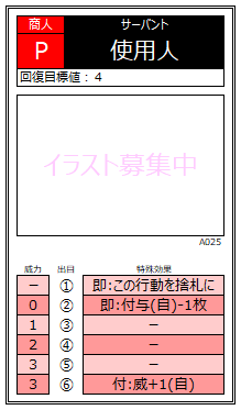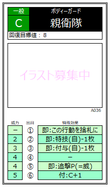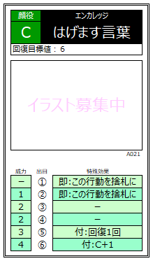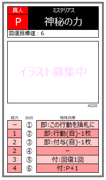 「行動」は捨札になるまでは何度でも使用可能。捨札から回復するための目標値が設定されており、目標値が高いほど回復しにくいが、威力は高い。