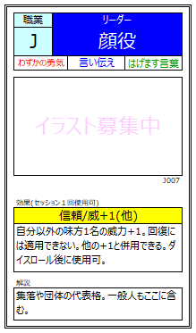 「職業」効果は1シナリオに1回使用可能。「特技」と「付与」は1回使うと捨札になる(何らかの方法で手札に戻ると、再び使えるようになる)。