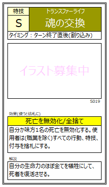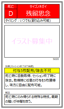 - キャラクターがロストし、すべての手札を失う。特技「残留思念」を自動取得し、使用する権利を得る。ターンの獲得、手札の回復や獲得が不可能。